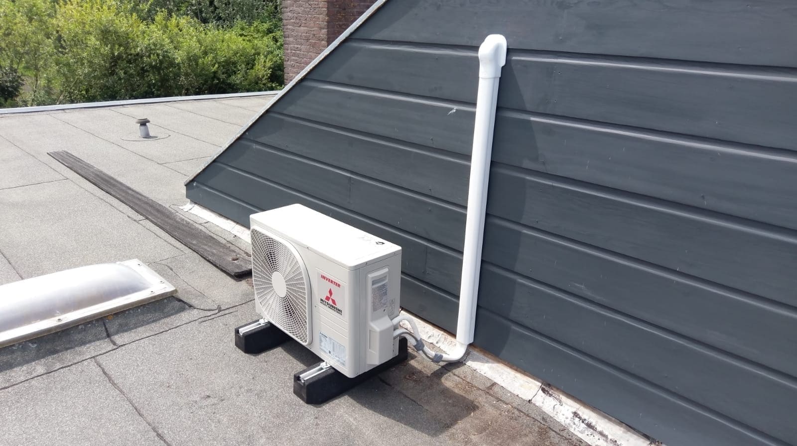 Op de onderstaande foto is goed te zien dat de buitenunit van de airco van de bovenslaapkamer op het aangrenzende dak is geïnstalleerd. De klant heeft zelf nog even de buitengoot geschilderd in de kleur van het huis zodat deze niet meer opvalt.